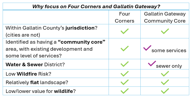 Project outreach was focused in Four Corners (Urban Growth Area and Public Infrastructure Holding Area) and the Gallatin Gateway Community Core (Rural Growth Area) because of the service and infrastructure availability in the areas relative to other parts of the County's jurisdiction, see the chart and maps below! Additionally, residents in these areas have shared concerns about increasing growth pressure in their neighborhoods and interest in standards to mitigate the impacts of development while promoting housing for people that work locally and/or want to age in place.